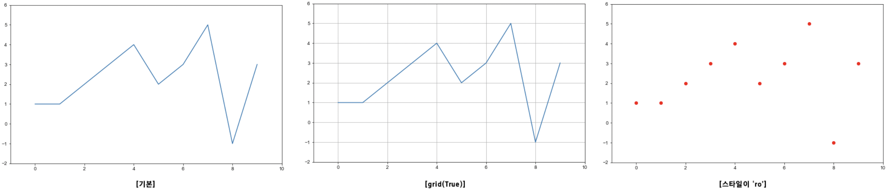 - 세번째 인자에 x, y 값 인자에 대해 선의 색상과 형태를 지정하는 포맷 문자열 입력 가능. ex) r--, bs, g^