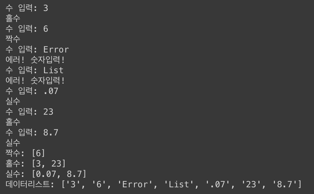 사용자로부터 숫자 5개를 입력받아, 짝수, 홀수, 실수로 구분해서 각각 리스트에 저장
