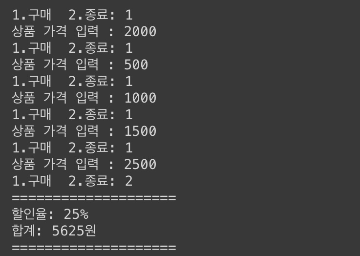 할인율 : 1개 구매 시 : 5% / 2개 구매 시 : 10% / 3개 구매 시 : 15% / 4개 구매 시 : 20% / 5개 이상 : 25%
