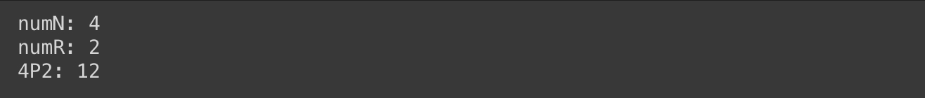 print(f'{numN}P{numR}: {pt.getPermutation(numN,numR,logPrint=False)}')