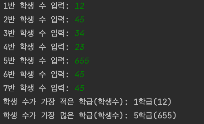 7개의 반의 학생 수를 입력 받아, 학생 수가 가장 많은 학급과 적은 학급을 구하기.