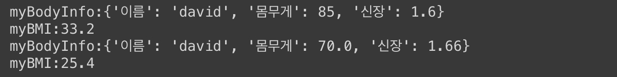 myBodyInfo = {'이름':'david', '몸무게':85, '신장':1.6}