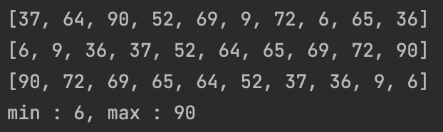 1부터 100까지 난수 10개를 뽑아 정렬하고 최대값과 최소값을 출력(삽입 정렬 사용)