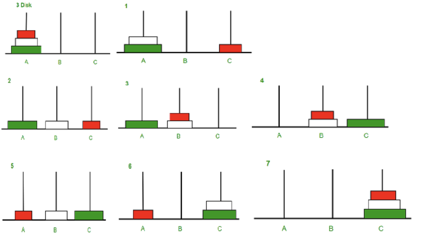 - 3개의 기둥에 적당한 개수의 원반을 쌓아 놓고 다른 쪽으로 옮기는 게임.