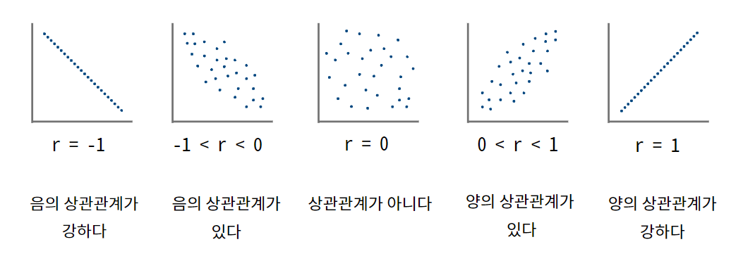 - 두 변수 간의 함수 관계가 선형적인 관계가 있는지 파악할 수 있는 측도