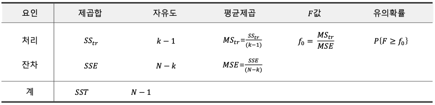 $H_0$: 각 집단의 평균은 동일하다 vs $H_1$ : 각 집단의 평균에 차이가 있다