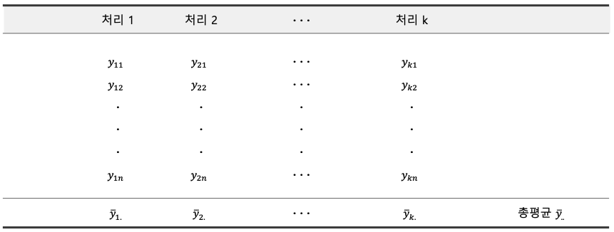 - 모집단의 평균들을 비교하기 위하여 특성값의 분산 또는 변동을 분석하는 방법