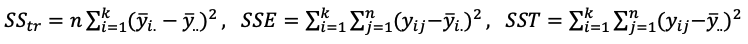 $SST = \sum\sum\sum(\overline{x_{ijk}}-\overline x)^2$ $SSB_i = \sum k_i(\overline{x_{ik}}-\overline x)^2$